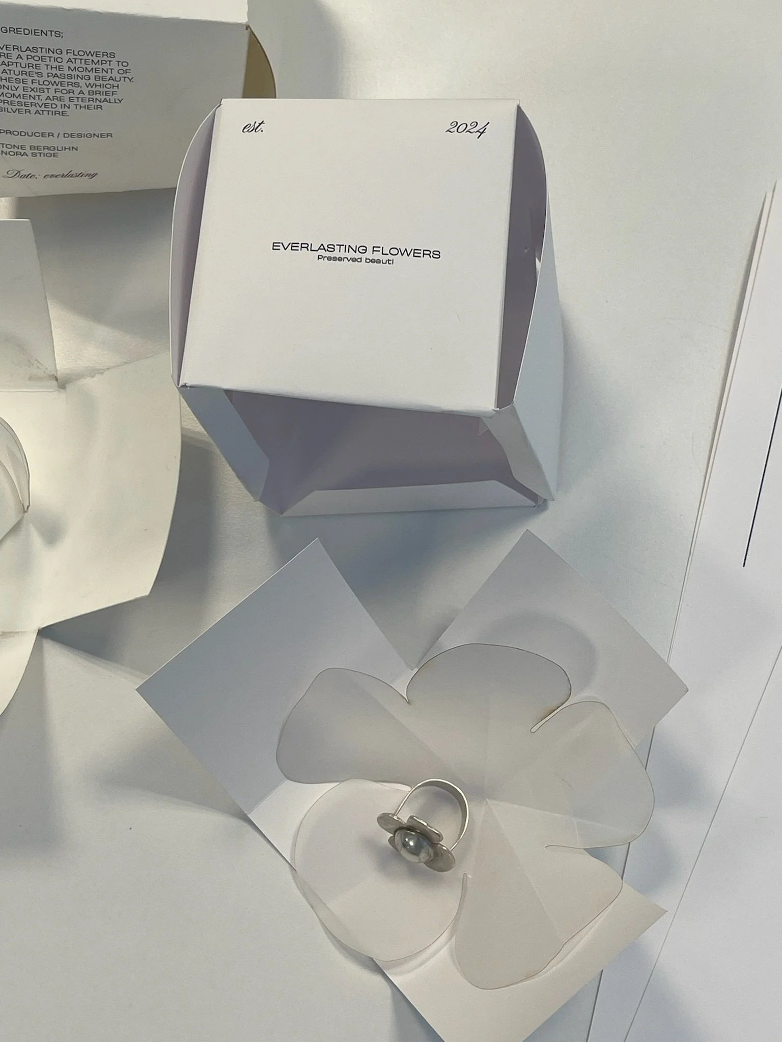 Everlasting Flowers er et poetisk forsøk på å fange øyeblikket av naturens forbigående skjønnhet. Blomstene, som bare eksisterer et kort øyeblikk, er evig bevart gjennom ulike grafiske uttrykk og håndverk. I prosessen benyttet vi metoder som smykkedesign, linoleumstrykk, fotografi, hekling, keramikk m.m. Prosjektet ble stilt ut på Grafills Hus mai 2024.